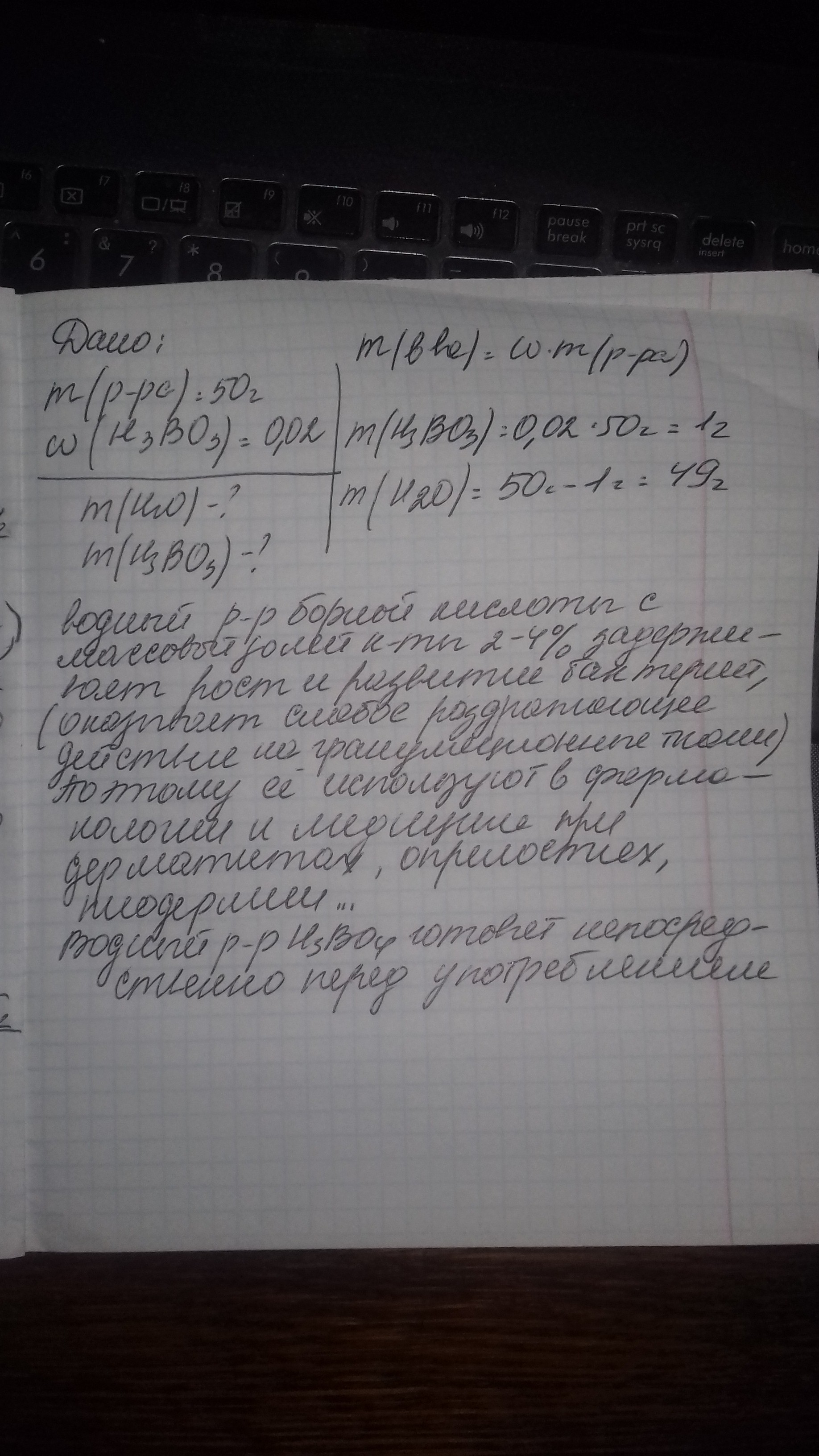 Определите массы воды и борной кислоты, необходимые для приготовления 50 г раствора массовой долей кислоты 0,02. Где применяют данный раствор?