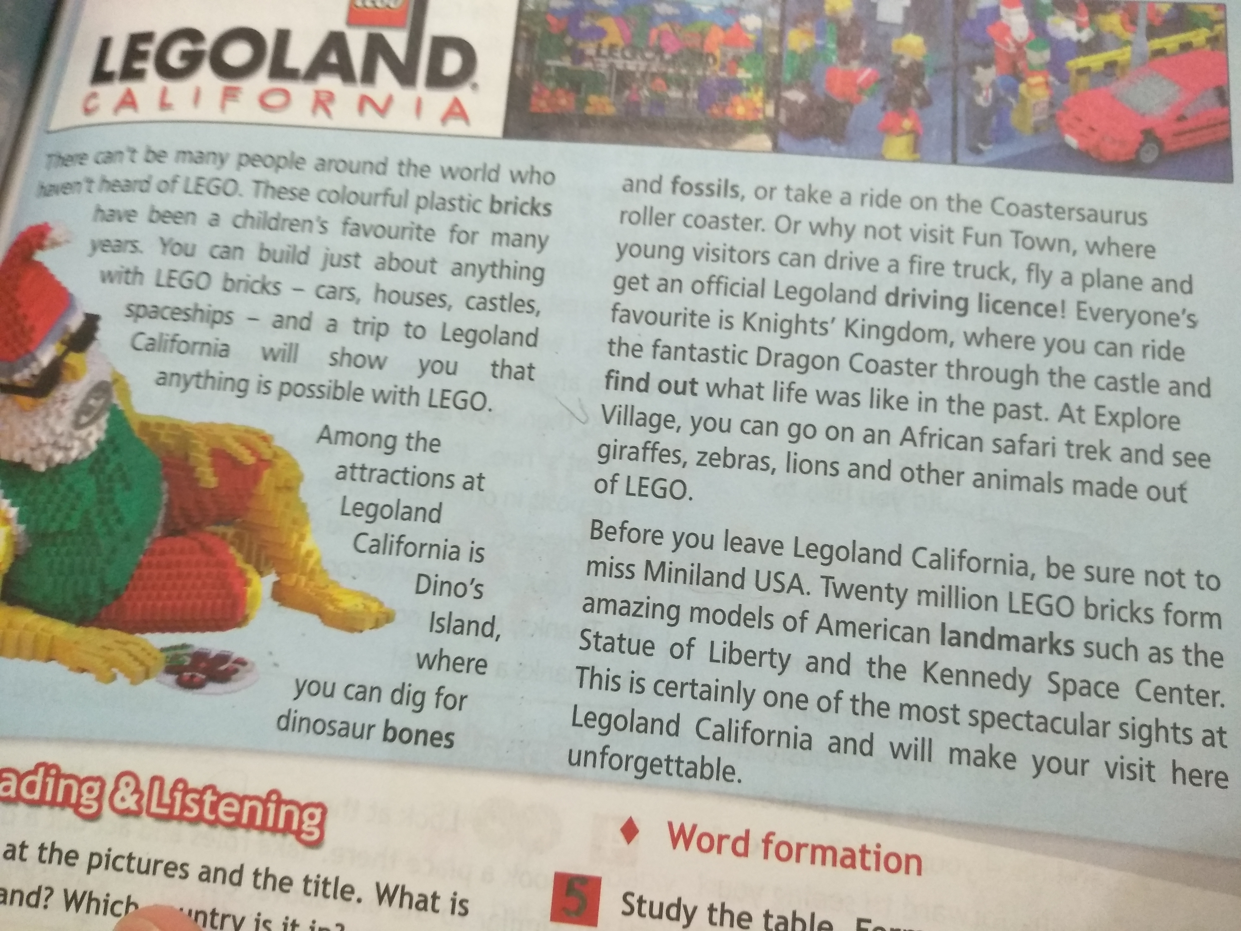 Everybody heard about LEGO. Many children loves LEGO. You can build anything with LEGO: cars, houses and spaceships. You can visit a Legoland California. There are Dino's island, where you can dig for dinosaur bones. There are Fun Town, where you can drive a firetruck or fly a plane. There are Knigt's Kingdom, where you can ride a dragon and explore the past life. You can also visit Explore Village there and see different animals like in African safari. But not forget to visit Miniland USA. You can see there fantastic models of american landmarks, such as Statue of Liberty or Kennedy Space Center. This place will make your journey unforgettable.