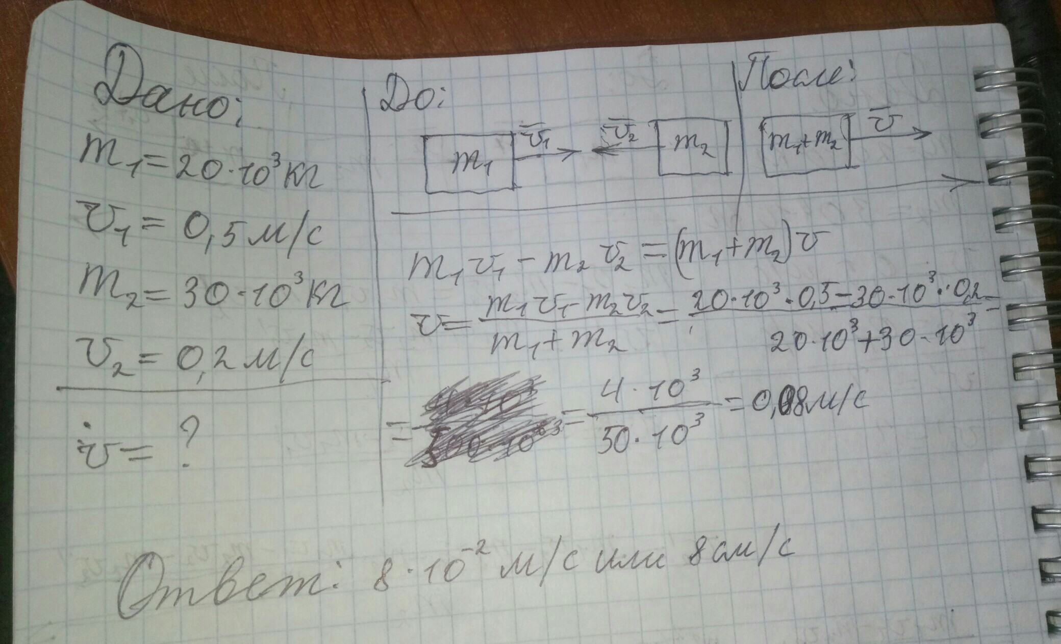 Вагон массой 20 т, движущийся со скоростью 0,5 м/с встречает вагон массой 30 т, движущийся навстречу первому со скоростью 0,2 м/с. Какова скорость вагонов после взаимодействия?