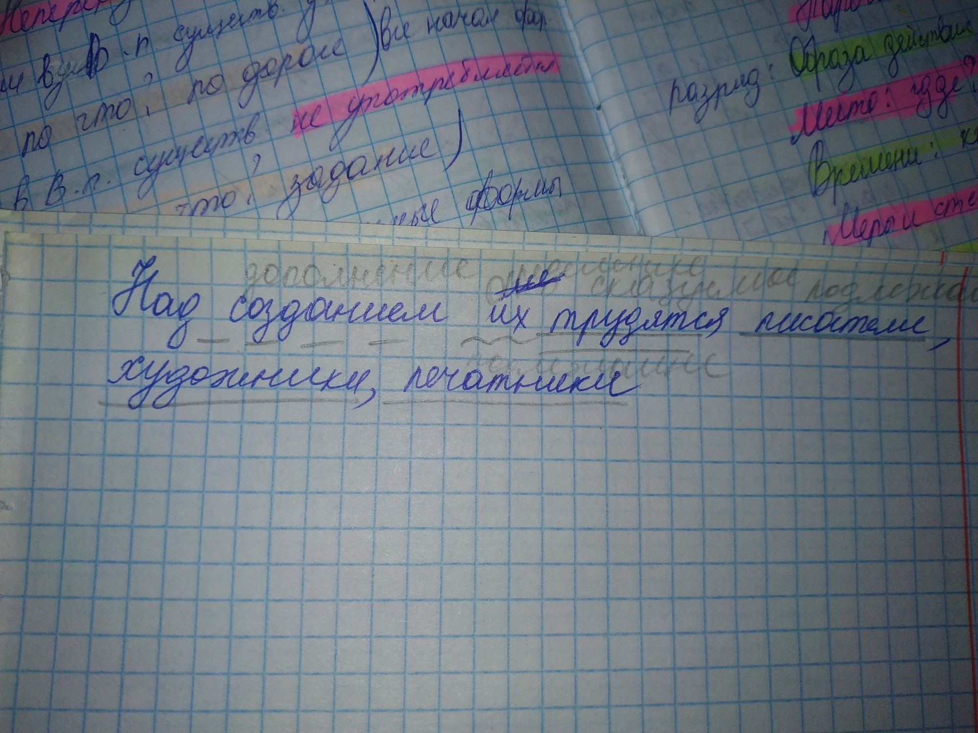 Подскажите пожалуйста.Как подчеркнуть предложение "над созданием их трудятся писатели, художники, печатники".