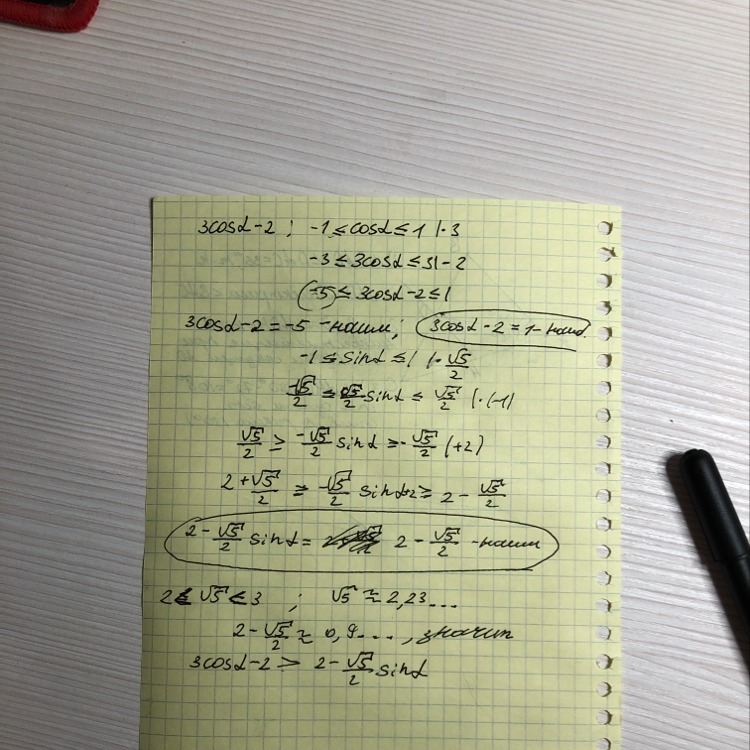 Сравните наибольшее значение 3 cos (альфа) - 2 с наименьшим значением 2 - √5/2 sin (альфа)