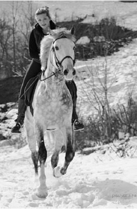 На фотографии мы видим девушку, которая скачет галопом верхом на лошади. Фотография черно-белая. Девушка снята анфас, то есть мы видим ее лицо, словно стоим на пути несущегося на нас коня. Конь очень красивый, масти "серый в яблоках". Я думаю, что снимок сделан в конце зимы или в начале весны, потому что среди снежного поля, по которому скачет конь, заметны проталины. К тому же одета девушка в легкую куртку и без шапки, то есть по-весеннему. Ее лицо выражает радость от прогулки и общения с природой. Девушке нравится ездить верхом - это видно даже на фотографии. Можно предположить, что она ездит верхом часто и очень любит своего четвероногого друга. Наверняка она сама ухаживает за своим конем и угощает его хлебом, сахаром и яблоками.