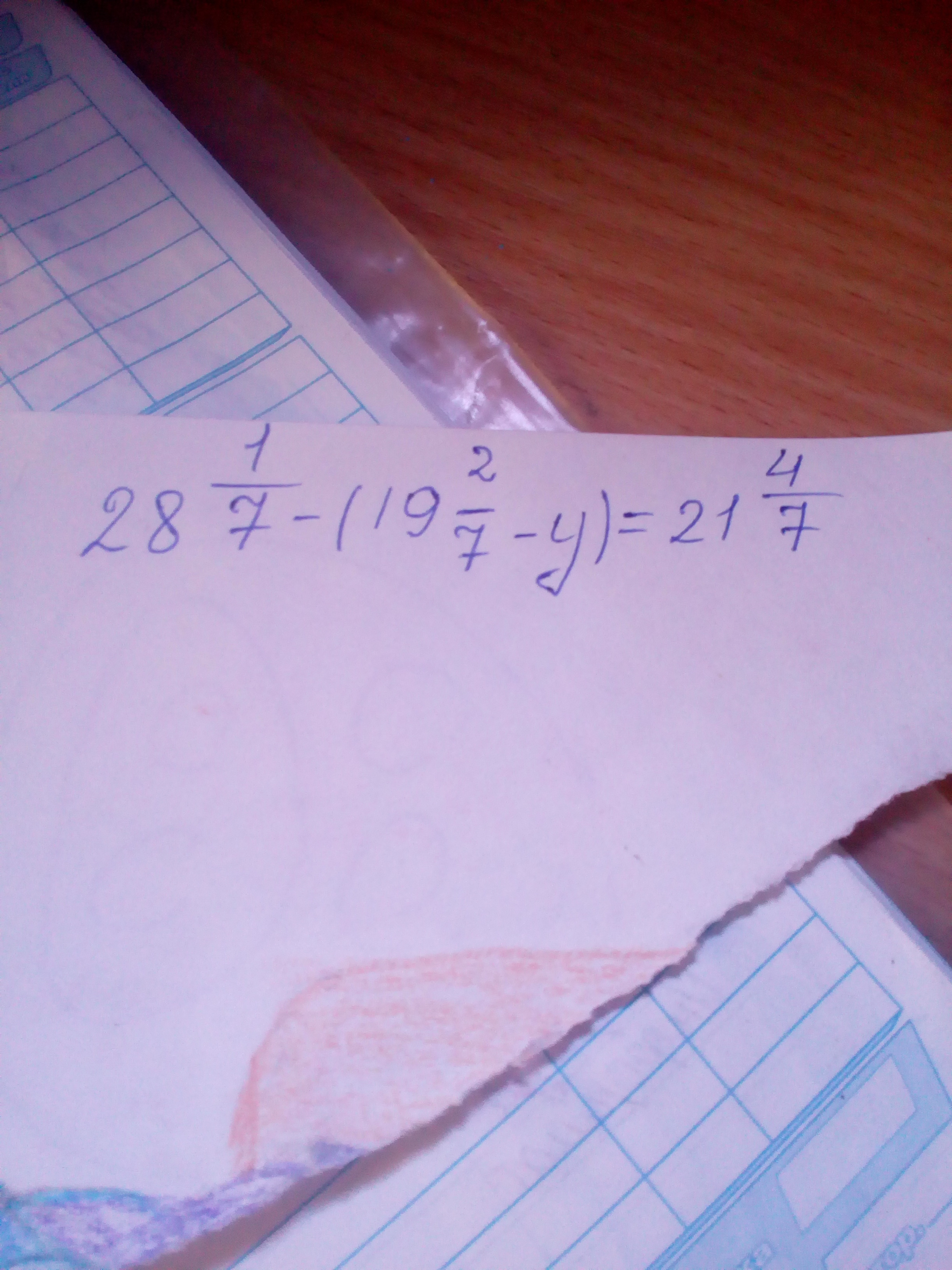 27 8/7 - 19 2/7 + y = 21 4/7