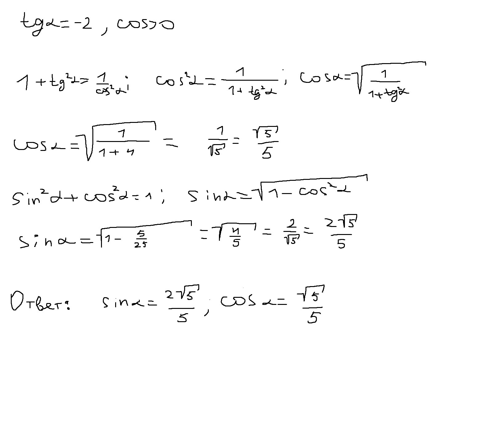 найдите sin a и cos a, если известно, что tg a = -2, cos a > 0