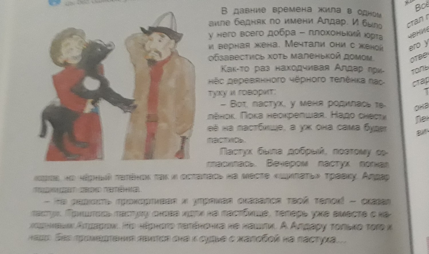 - На редкость прожорливый и упрямый оказался твой телок! (м.р.) - сказал пастух (м.р.). Пришлось пастуху (м.р.) снова идти на пастбище (ср.р.), теперь уже вместе с находчивым Алдаром (м.р.). Но чёрного телёночка (м.р.) не нашли. А Алдару (м.р.) только того и надо. Без промедления (ср.р.) явился он к судье (м.р.) с жалобой (ж.р.) на пастуха(м.р.)...