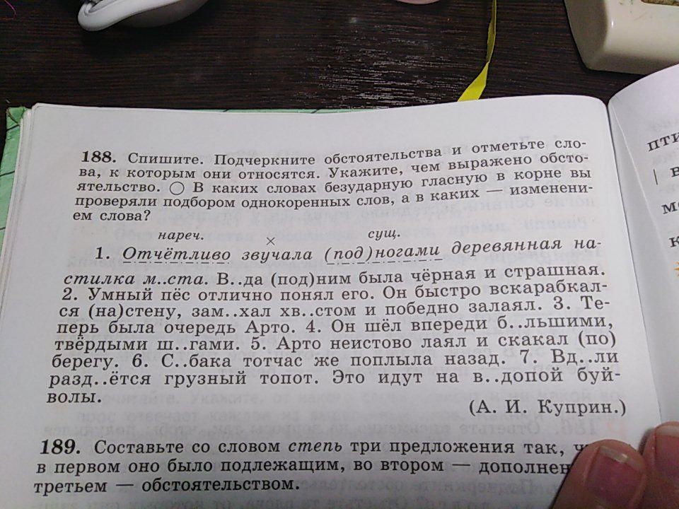 Спишите. Подчеркните обстоятельства и отметьте слова, к которым они относятся. Укажите, чем выражено обстоятельство э. В каких словах безударную гласную в корне вы проверяли подбортм однокоиенных слов, а в каких–изменением слова? (текст на фото)