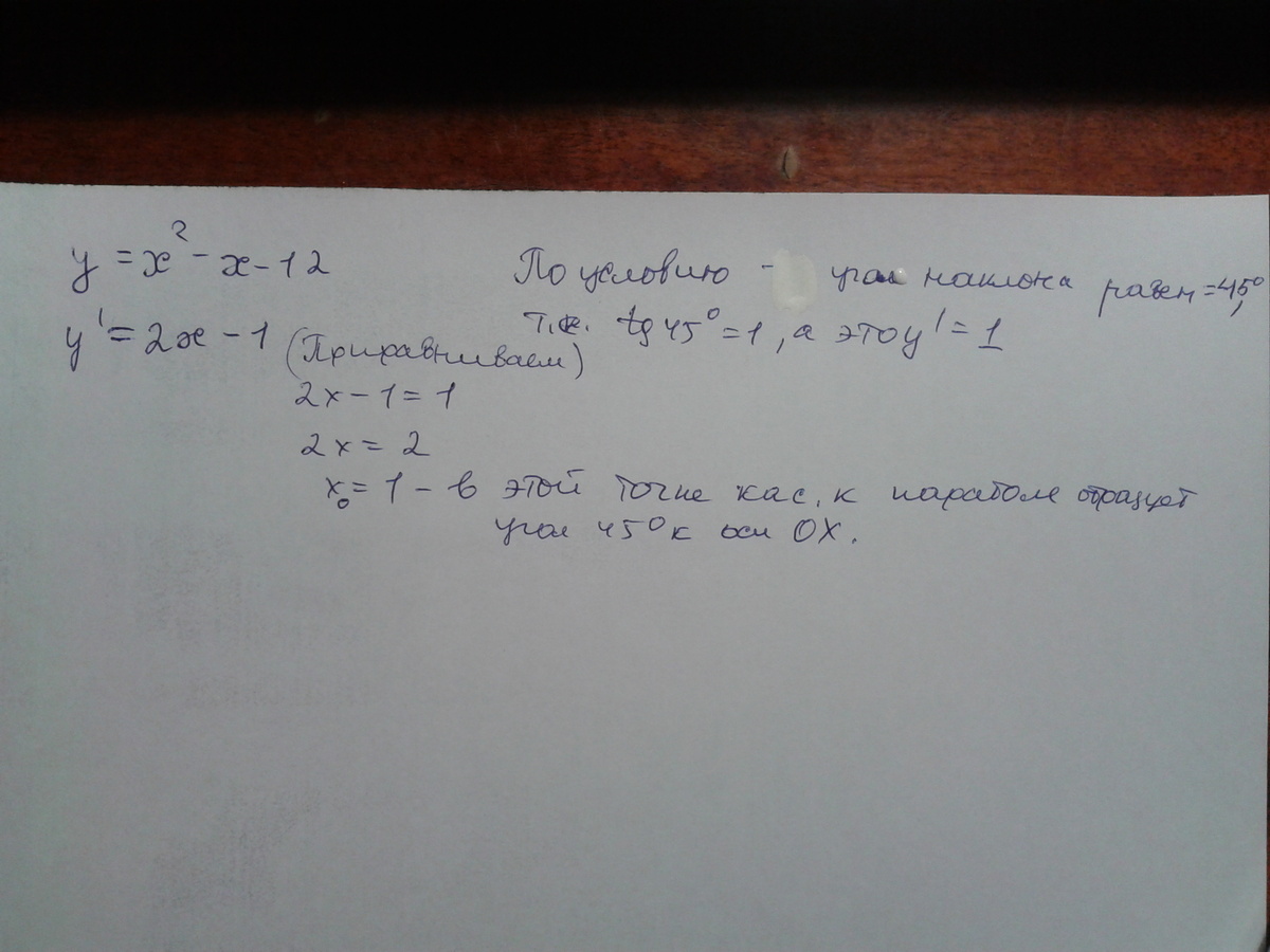 Найти координату точки , в которойНайти координату точки , в которой касательная к параболе y=x(в квадрате)-x-12 образует с осью OX угол 45 градусов