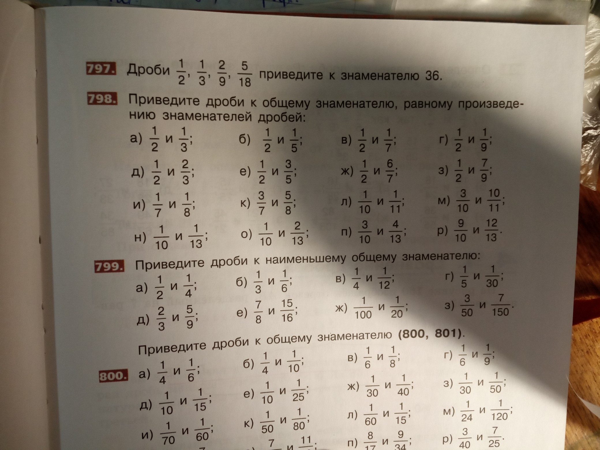 Ответ: я решать за тебя не буду, просто объясню, в 798 номере в задании А знаменатели 2 и 3. тебе просто нужно умножить эти 2 числа так, чтобы в обоих числах получился одинаковый знаменатель(6). Значит 2 нужно умножить на 3, а 3 на 2.