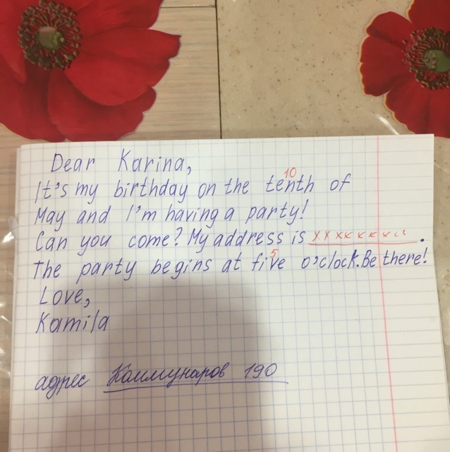 I have a Birthday 10th of May and I will have a Party! Can you come? My adress is Kommunarov street, 190. The party will start at 5 o'clock. Be there!