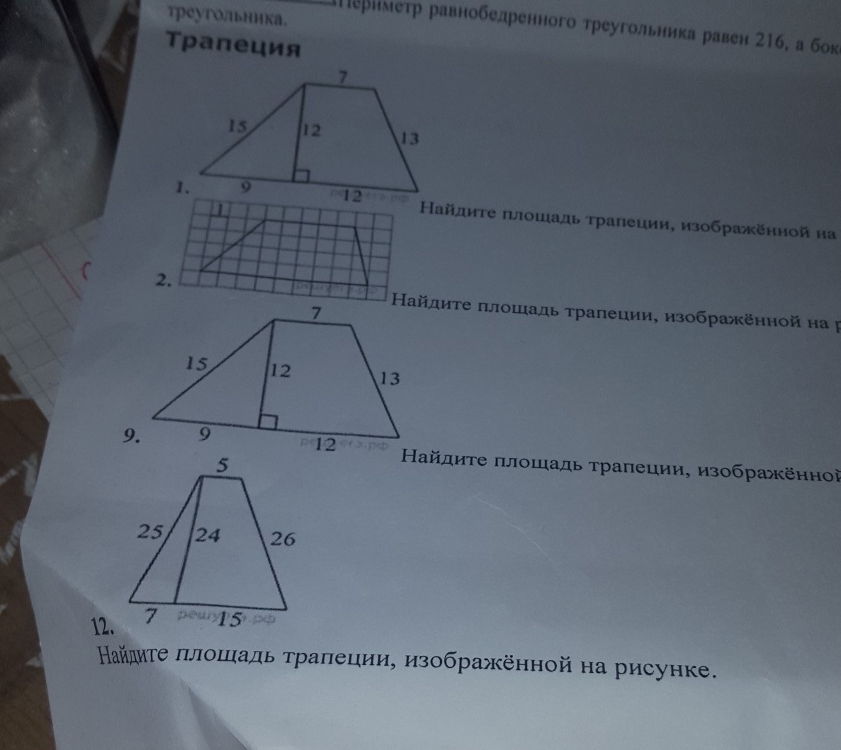 1 (+3 рисунок (одинаковые)): S= 0,5*12*(7+9+12)=168