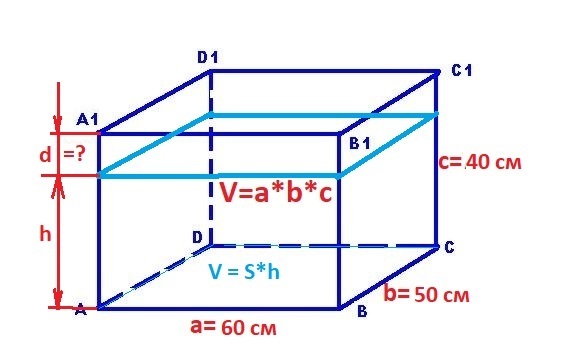 Длина аквариума равна 60 см, ширина – 50 см, а высота – 40 см. В аквариум налили 75 литров воды. Найдите расстояние между уровнем воды и верхним краем аквариума. Ответ дайте в сантиметрах. СПОЧНО 50 БАЛЛОВ!!!!!!