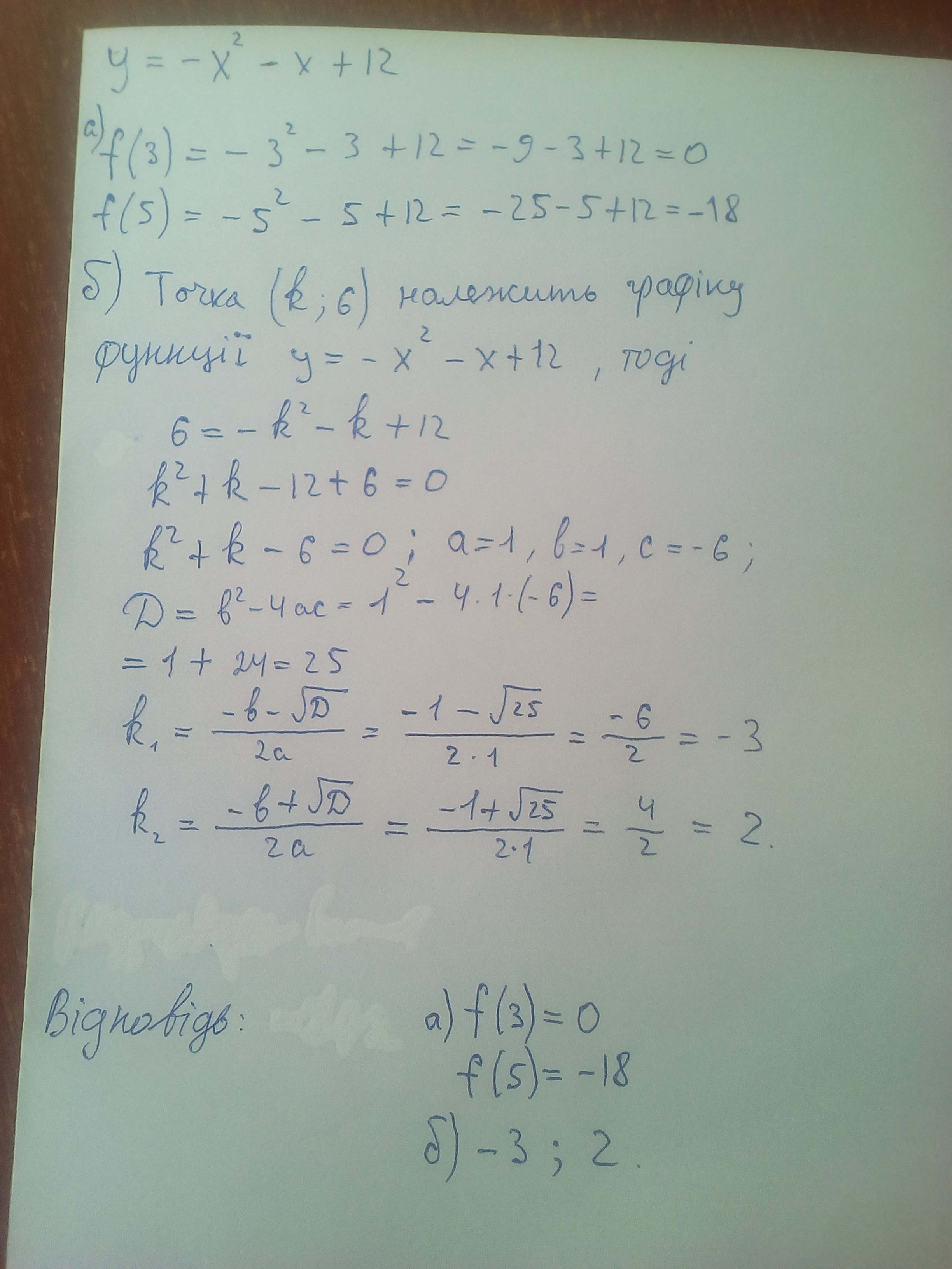 *точка (k;6) пренадлежит графику функции y = - x^2 - x + 12 , тогда: …