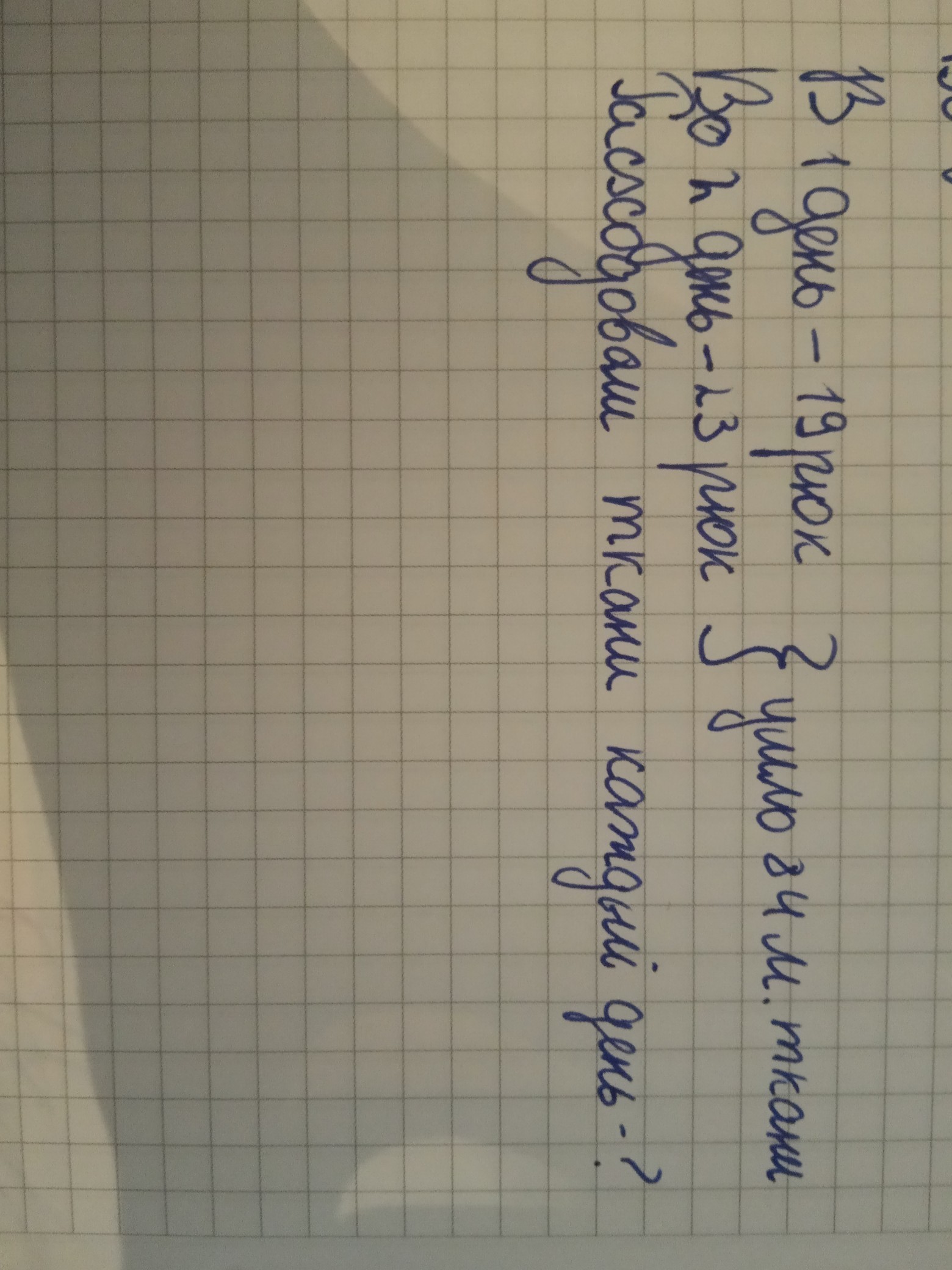 помогите записать условие задачи.в мастерской в первый день сшили 19 одинаковых рюкзаков во второй 23 таких рюкзака на все эти рюкзаки пошло 84 м ткани сколько метров ткани расходовали каждый день