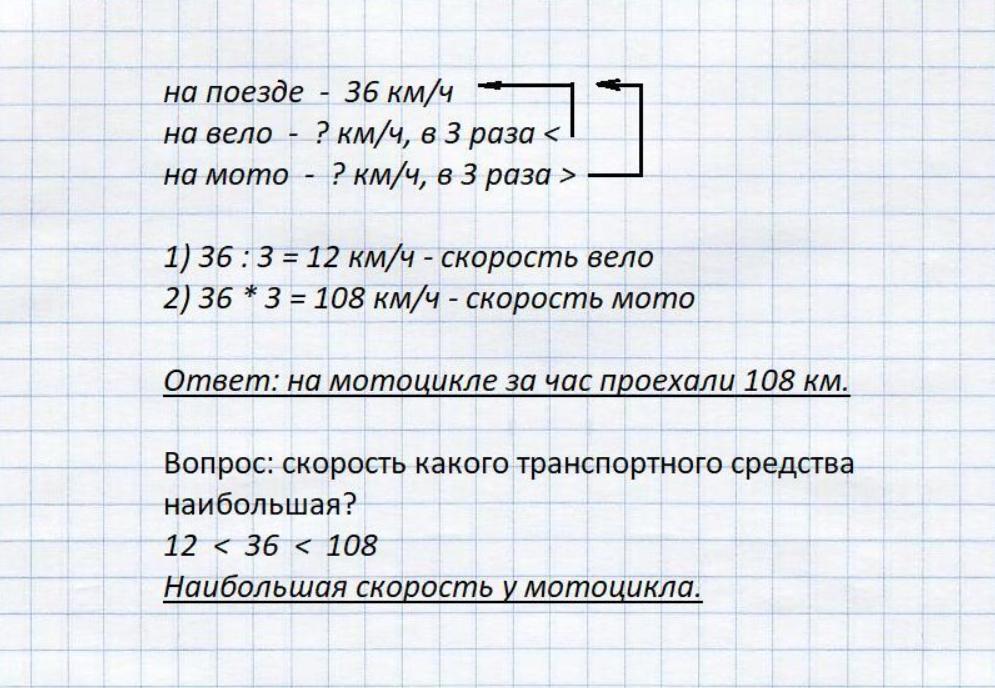 на поезде за час проехали 36 км на велосипеде в 3 раза меньше а на мотоцикле в 3 раза больше чем на поезде сколько км проехали на мотоцикле сформулируй условие и вопрос задачи используя слово скорость