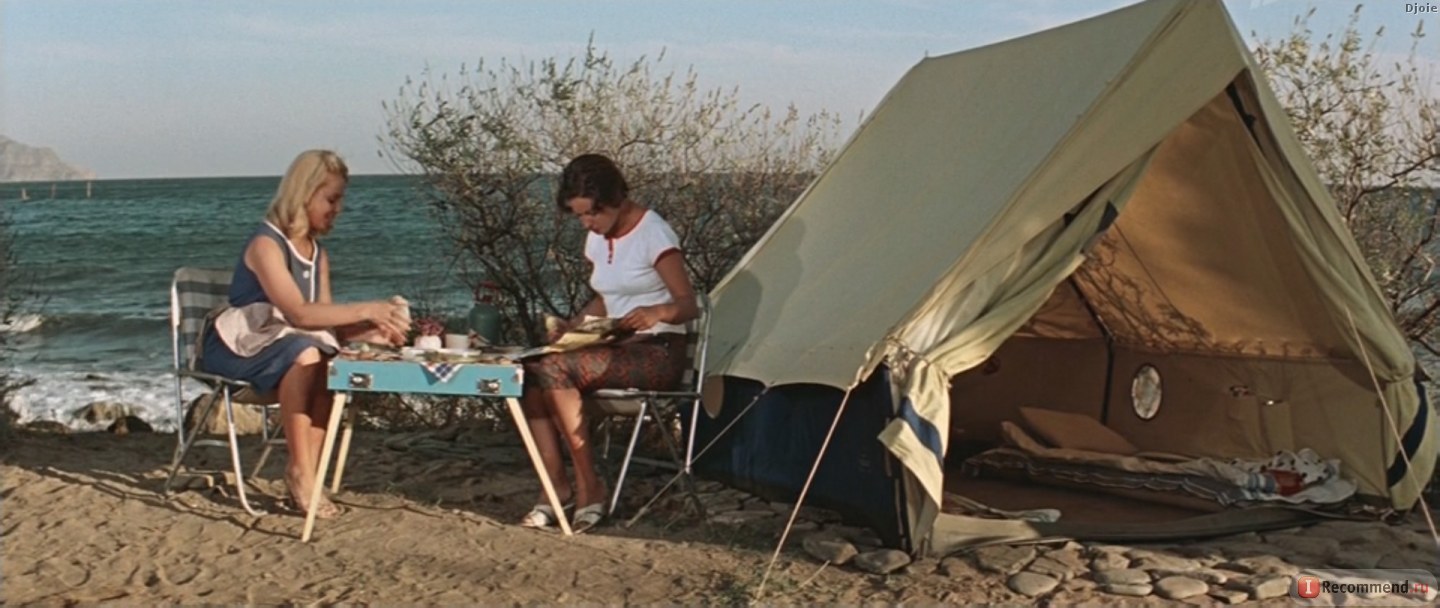 Две девушки сидят на берегу моря . Могу предположить , что на улице давольно таки жарко , так как девушки легко одеты . По моему мнению , девушки пришли сюда с ночевкой , так как поставили палатку . На стол они положили еду и питье все то , что нужно для отдыха . Каждая из них занята чем то своим . Девушка в белой одежде , возможно , читает какой нибудь модный журнал . Девушка же