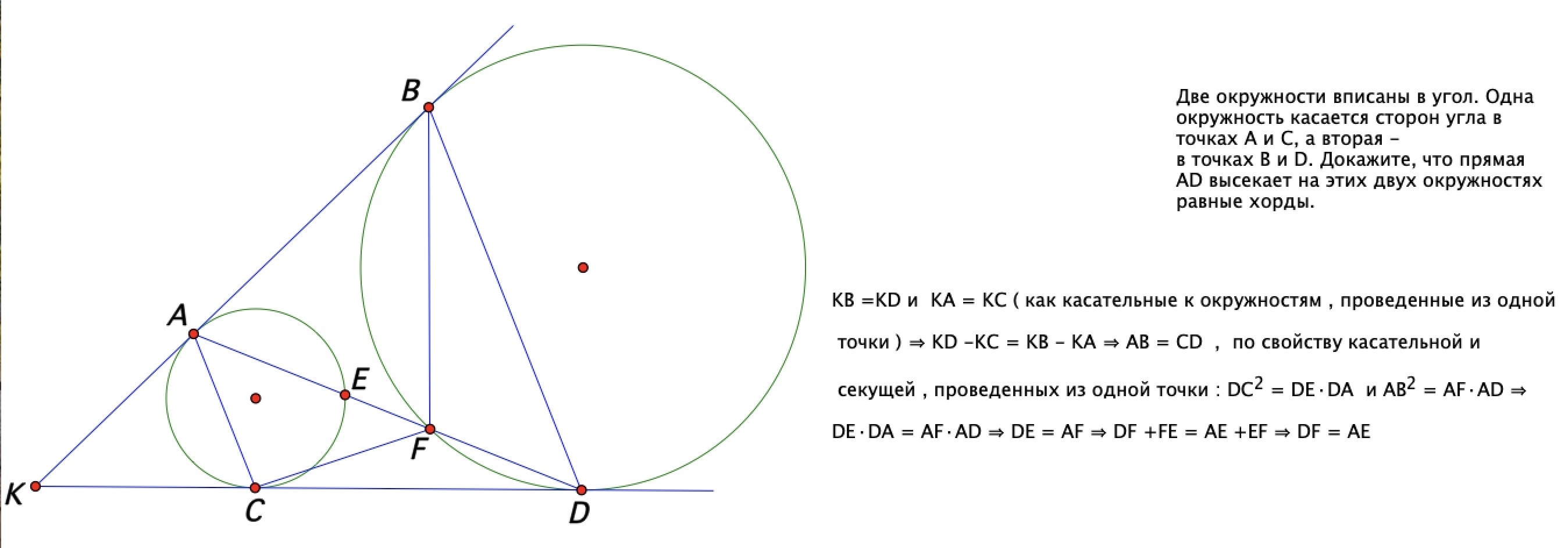 в точках В и D. Докажите, что прямая АD высекает на этих двух окружностях равные хорды.