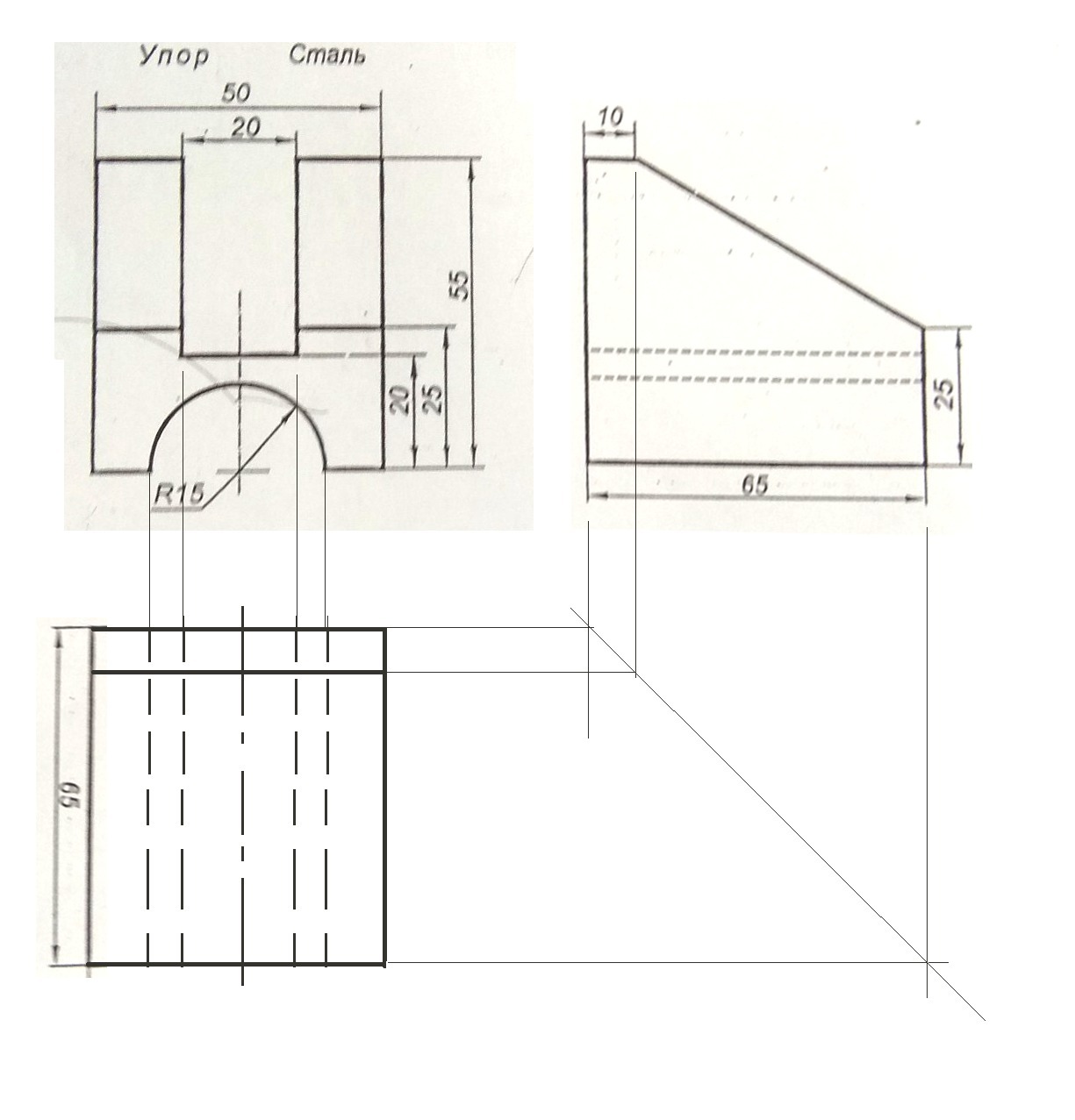Скорей всего тут надо построить горизонтальную проекцию, так как фронтальная и профильная проекция даны. Для построения горизонтальной проекции необходимо произвольно отступить от фронтальной проекции и определить начало горизонтальной проекции. Отложить ширину детали (65мм). См. рисунок. Провести линию проекционной связи до пересечения с линией проекционной связи той же грани на профильной проекции. найти точку пересечения линий проекционной связи с противоположной грани. Через полученные точки провести постоянную прямую, которая и определит дальней шее построение горизонтальной проекции.