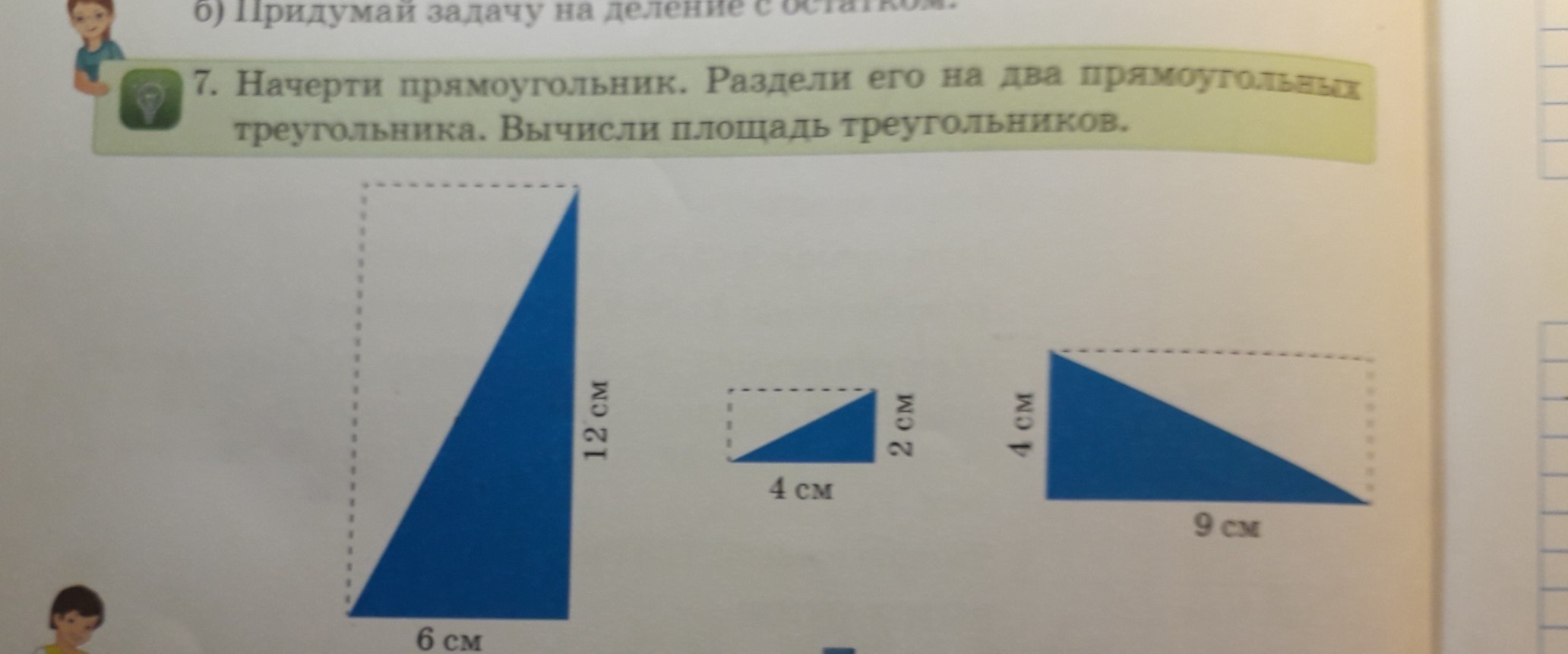 начерти прямоугольник .Раздели его на два прямоугольных треугольника. Вычисли площадь треугольниеов. помогите плиз не могу понять.