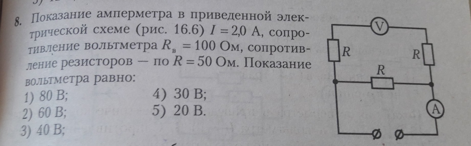 Тебя испугало точно вольтметр не идеальный?Это ничего если вольтметр не идеальный то он показывает напряжение на своих выводах т.е. напряжение на нем .Если вверху общее сопротивление 200 Ом а внизу в четыре раза меньше значит внизу ток в четыре раза больше т.е. если сверху течет ток | то снизу 4| а при слиянии токов в узле получается ток 5| а этот ток в свою очередь равен показанию амперметра находим | и внизу напряжение 200 | и вверху тоже вычитаем напряжение обоих сопротивлений и находим
