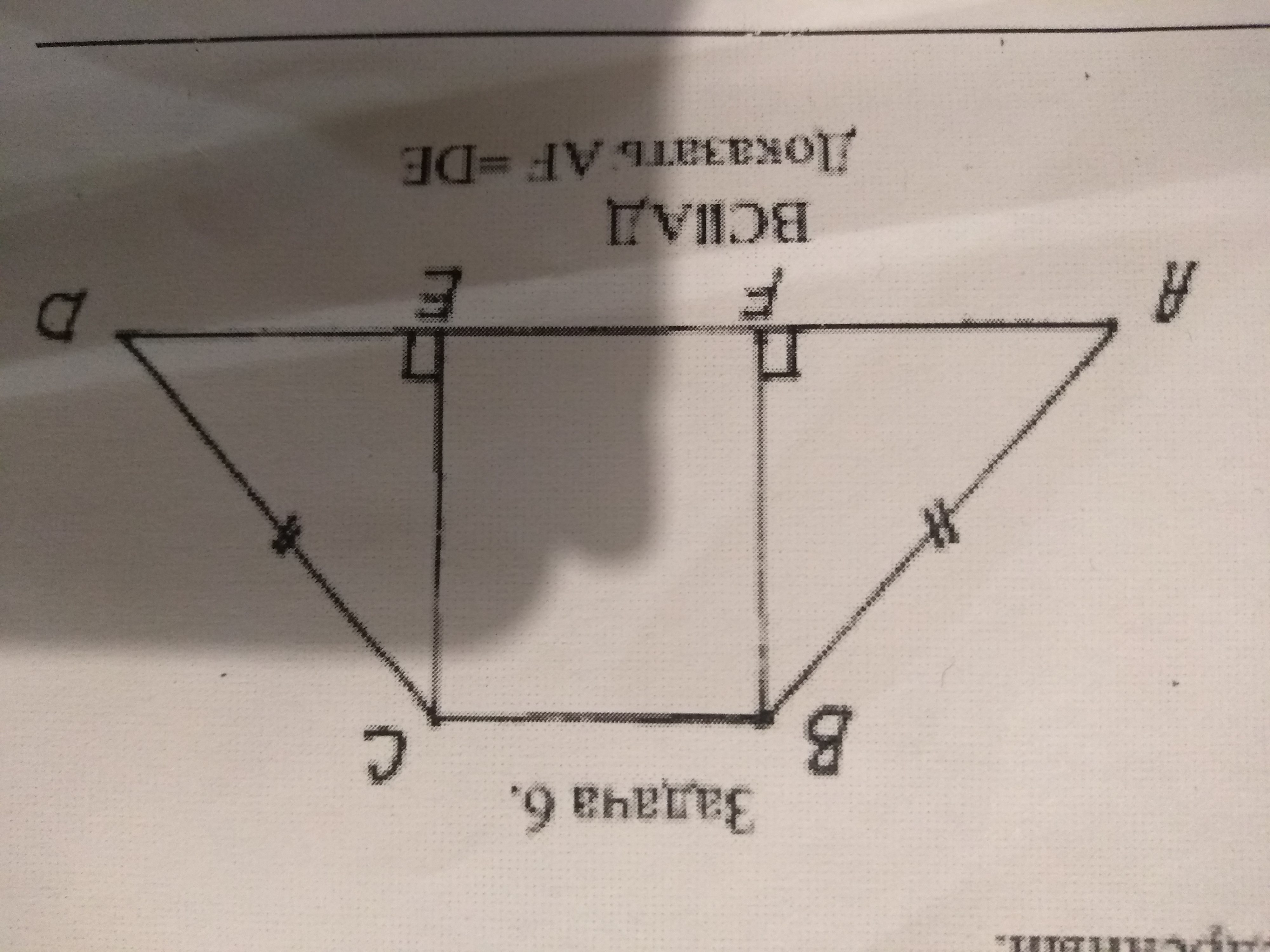 В условии задачи сказано, что трапеция равнобедренная, АВ = СД, ВФ и СЕ - перпендикуляры, которые делают фигуру ВСЕФ - прямоугольником, (все куты = 90 градусов). ВФ = СЕ, АВ = СД --> прямоугольные треугольники равные за катетом и гипотенузой. У всех равных треугольников соответствующие элементы равны. АФ = ДЕ