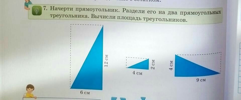 начерти прямоугольник. раздели его на два равных треугольника. найди площадб прямоугольного треугольника