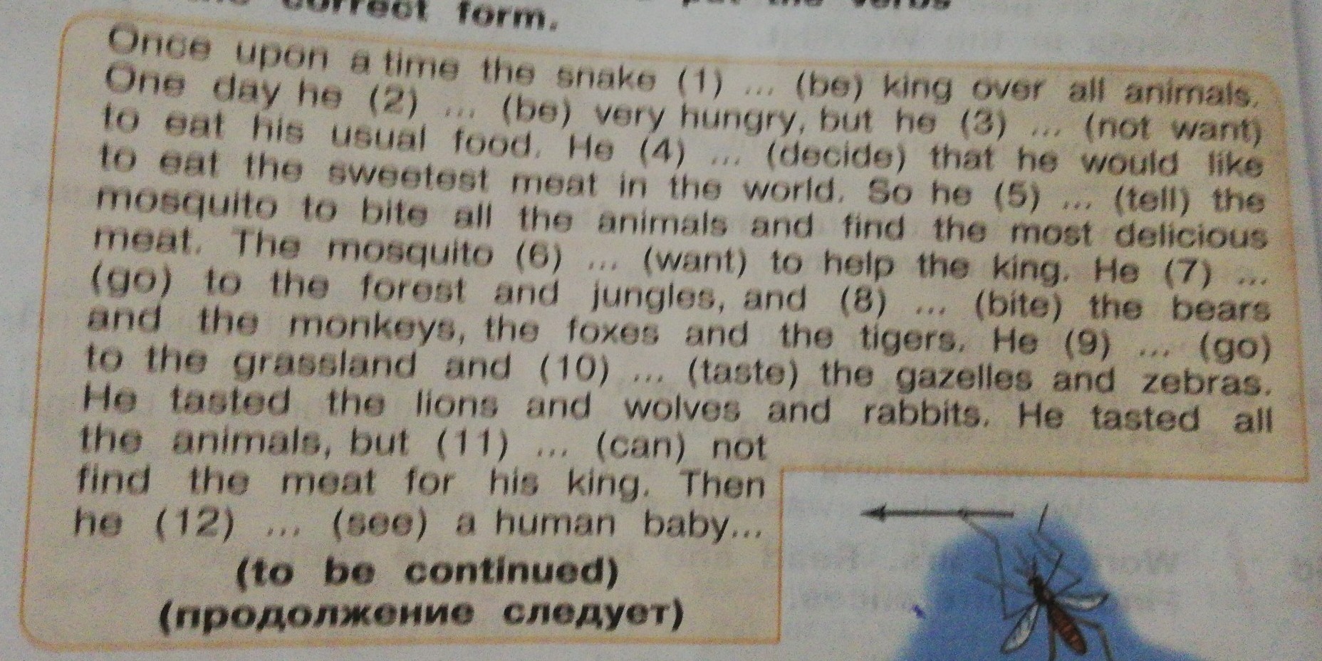 Давным-давно змей был королем всех животных.Однажды он очень проголодался,но не хотел есть свою обычную еду.Он решил,что он хочет попробовать самое вкусное мясо в мире.Так он сказал комару покусать всех животных и найти самое вкусное мясо .Комар захотел помочь королю.Он полетел в леса и джунгли и укусил медведей и обезьян,лис и тигров.Он полетел на луг и попробовал газелей и зебр.Он попробовал львов и волков и зайцев.он попробовал всех животных,но не смог найти мясо для короля.Потом он увидел человеческого ребенка...