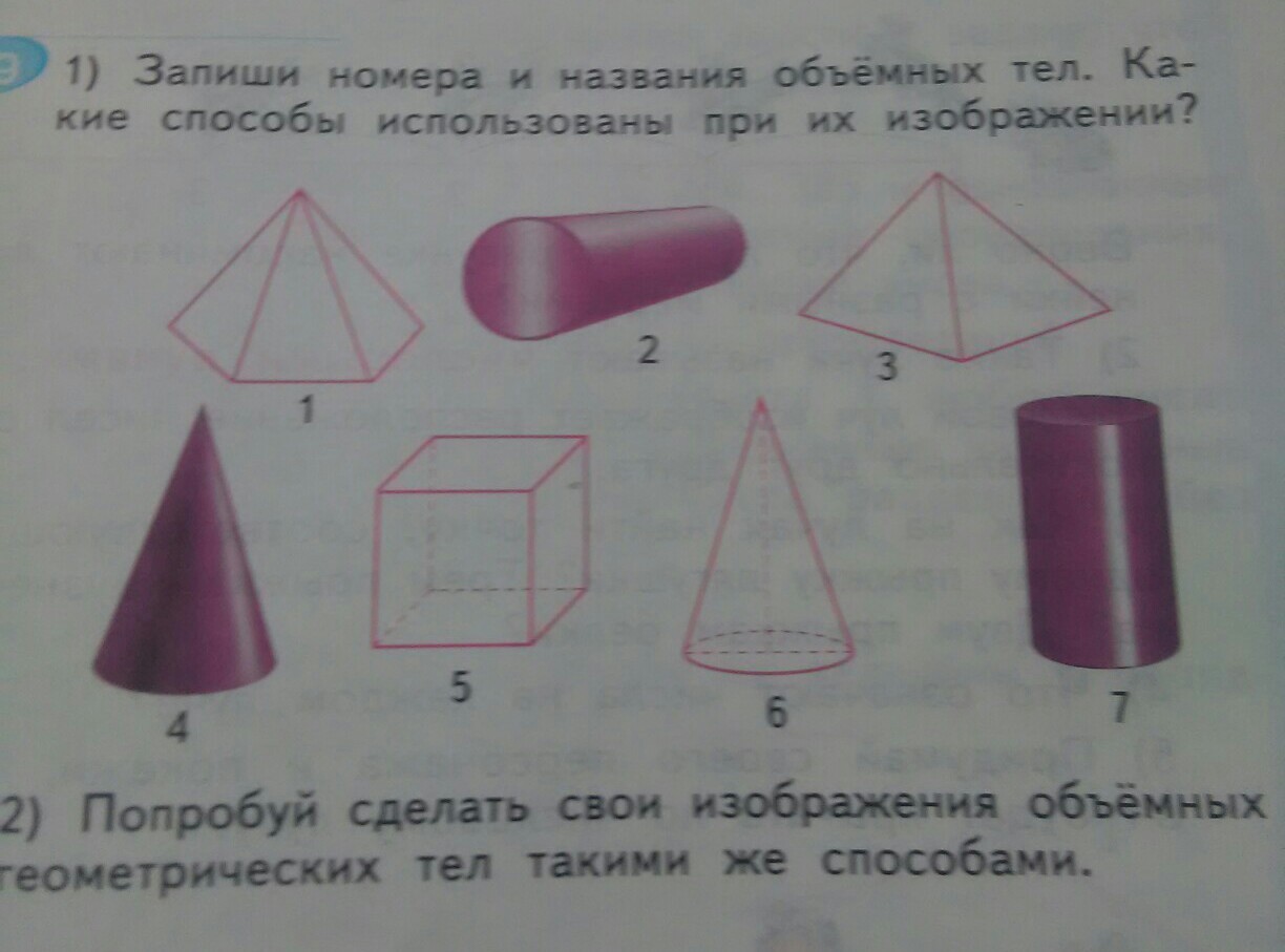 1)Запиши номера и названия объемных тел. какие способы использованы при их изображении? 2) Попробуй сделать свои изображения геометрических тел такими же способами.