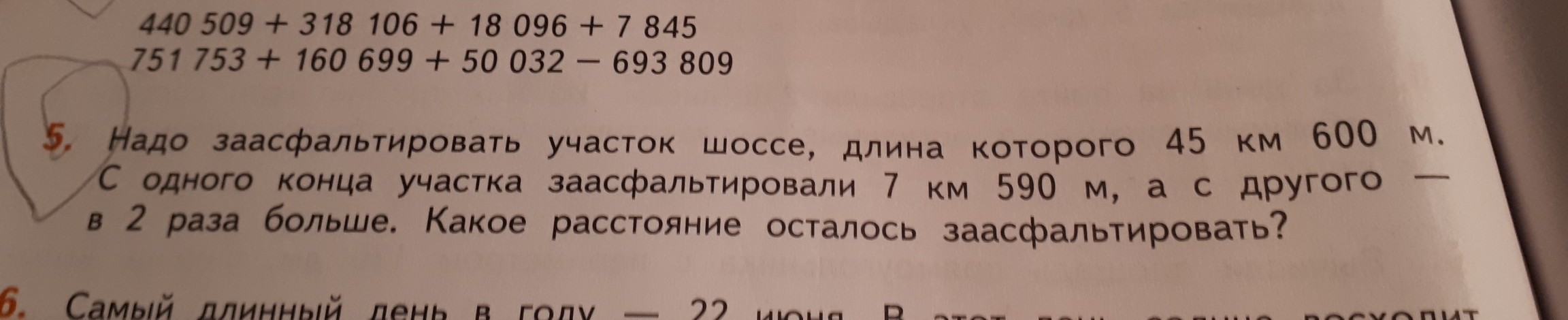 Отнимаешь от общей длины сначала сколько заасфальтировали с одной стороны, потом с другой, с одной стороны 7590 м, с другой в 2 раза больше, значит 15180 с другой, это все отнимаешь от 45600. Получается 22830м,это 22 км 830 метров