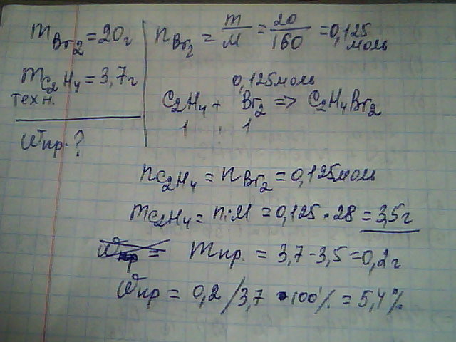 вычислите массовую долю примесей в этене если для реакции с бромом взяли 3.7 г этого газа а прореагировало 20г брома