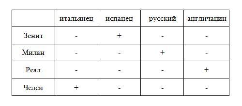 Тренер "Милана" - не англичанин и, так как у "Милана" остается только одна свободная клетка, то тренер этой команды - русский. Ставим "плюс" и остальные по вертикали - "минус".