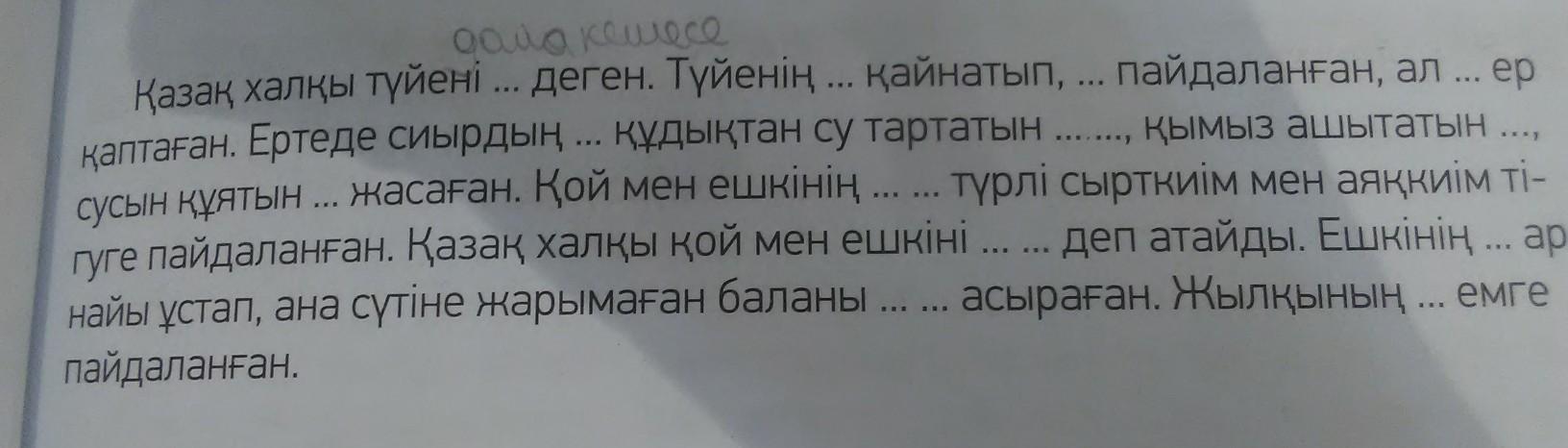 Көп нүктенің орнына қажетті сөздерді жазып, сөлемдерді толықтыр.
