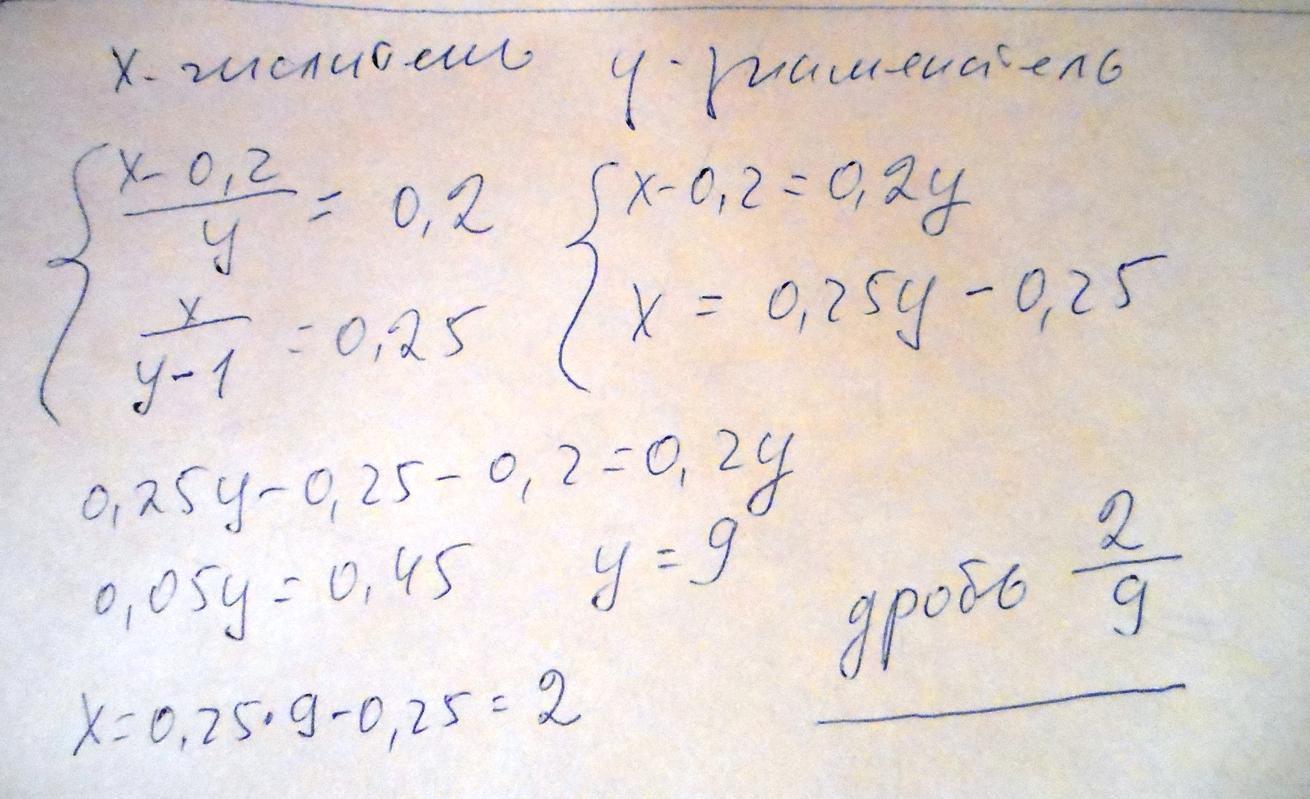 если числитель дроби уменьшить на единицу то дробь становится равна 0,2 А если знаменательная уменьшить на единицу то дробь становится равна 0,25 Найдите эту дробь