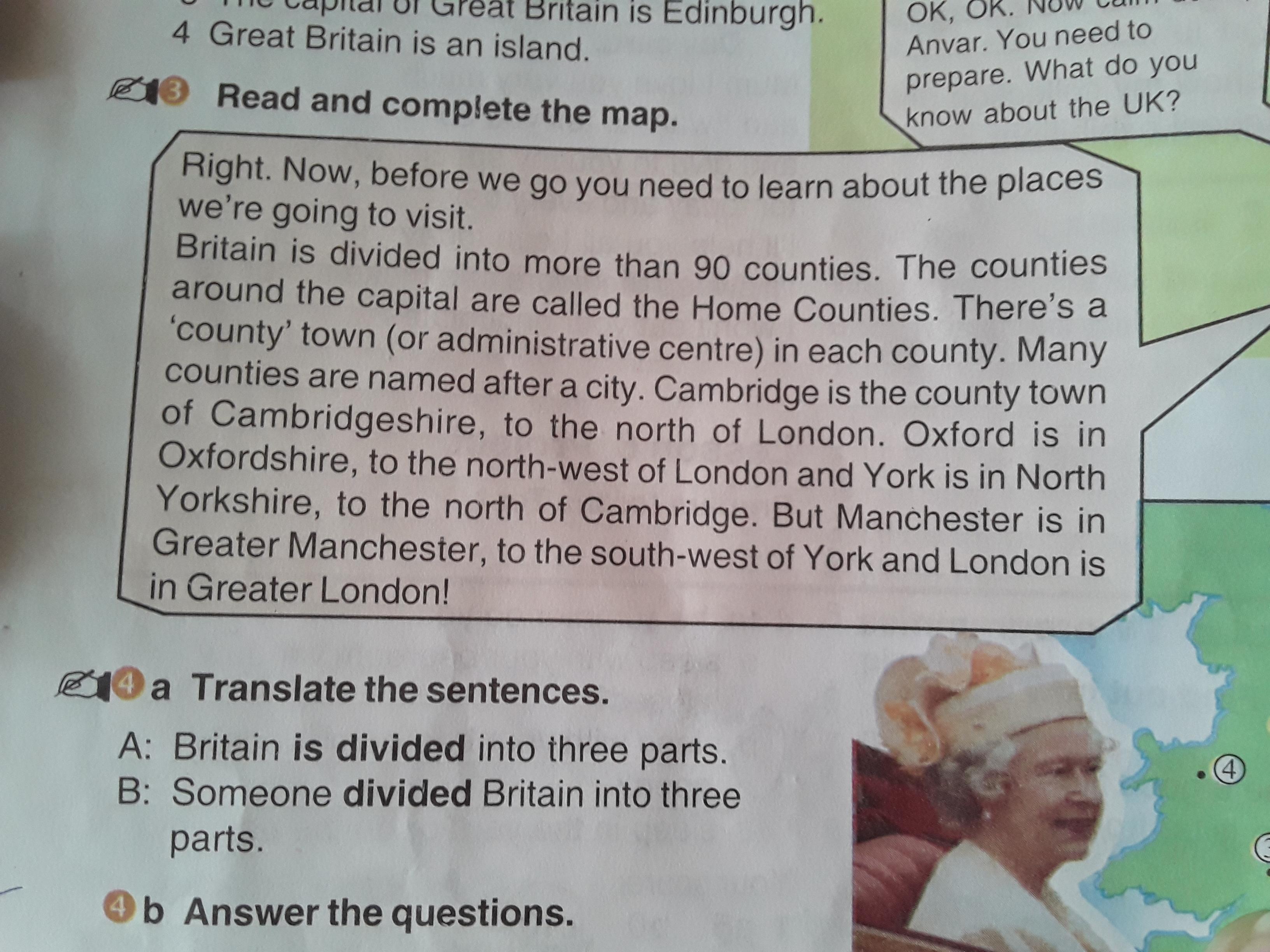 Правильно. Сейчас мы собираемся посетить. Британия разделена на более чем 90 округов вокруг столицы, называемых округами внутренних дел. Итак, прежде чем мы пойдем, вам нужно узнать о местах. Округа - это городской округ (или административный центр) в каждом округе. Многие округа названы в честь города. Кембридж - уездный город Кембриджшир, к северу от Лондона. Оксфорд находится в Оксфордшире, к северо-западу от Лондона, а Йорк - в Северном Йоркшире, к северу от Кембриджа. Но Манчестер находится в Большом Манчестере, к юго-западу от Йорка, а Лондон - в Большом Лондоне!