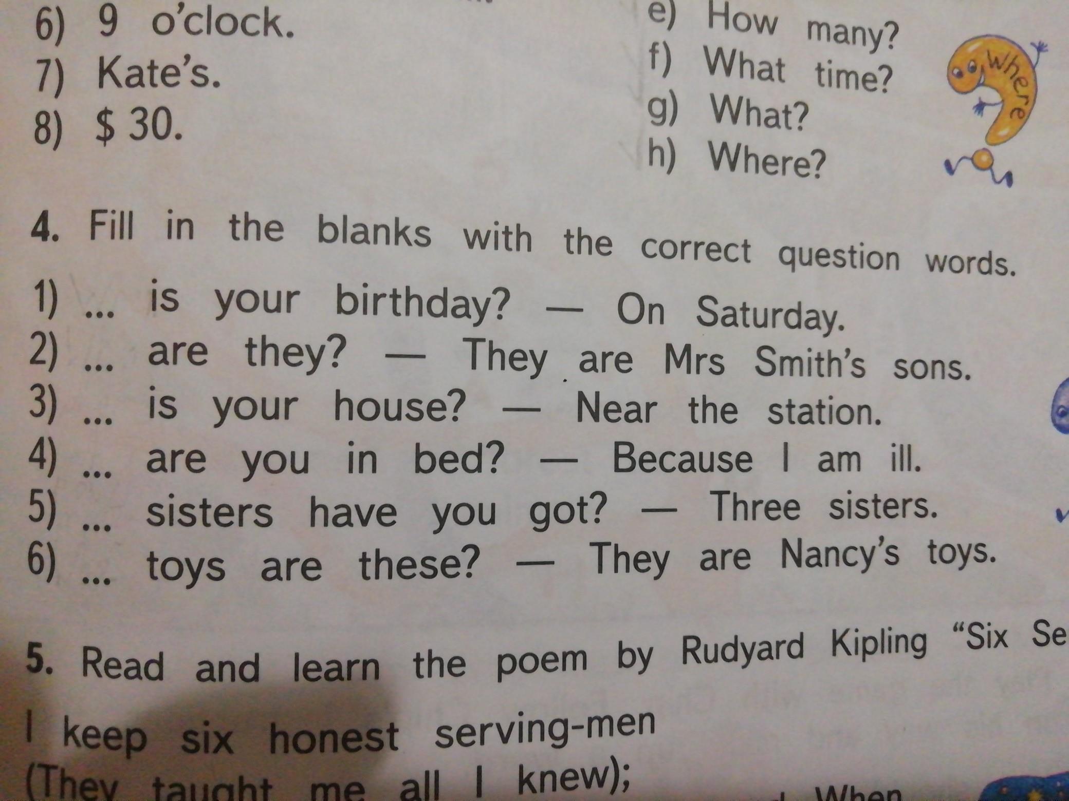 4. Заполните пропуски правильными словами вопроса. 1) твой 3) твои они? Они день рождения? В субботу. 2) ... 4) ... ты в доме? Рядом сыновья миссис Смит. кровать? - из-за станции я болею. сестры. 5) .. сестры у вас есть? Три 6) это игрушки? Это игрушки Нэнси. Редьярд Киплинг и учиться