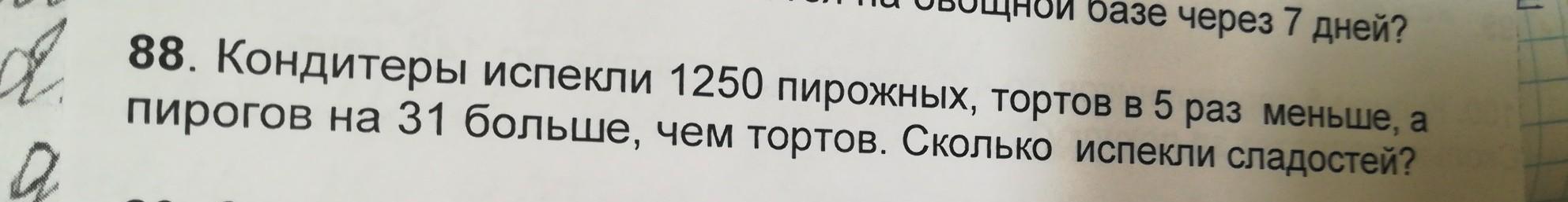 кондитеры испекли 1250 пирожных, тортов в 5 раз меньше, а пирогов на 31 больше, чем тортов. Сколько сладостей испекли? 1 - 4 классы ОТВЕТЬТЕ ПЖ!!