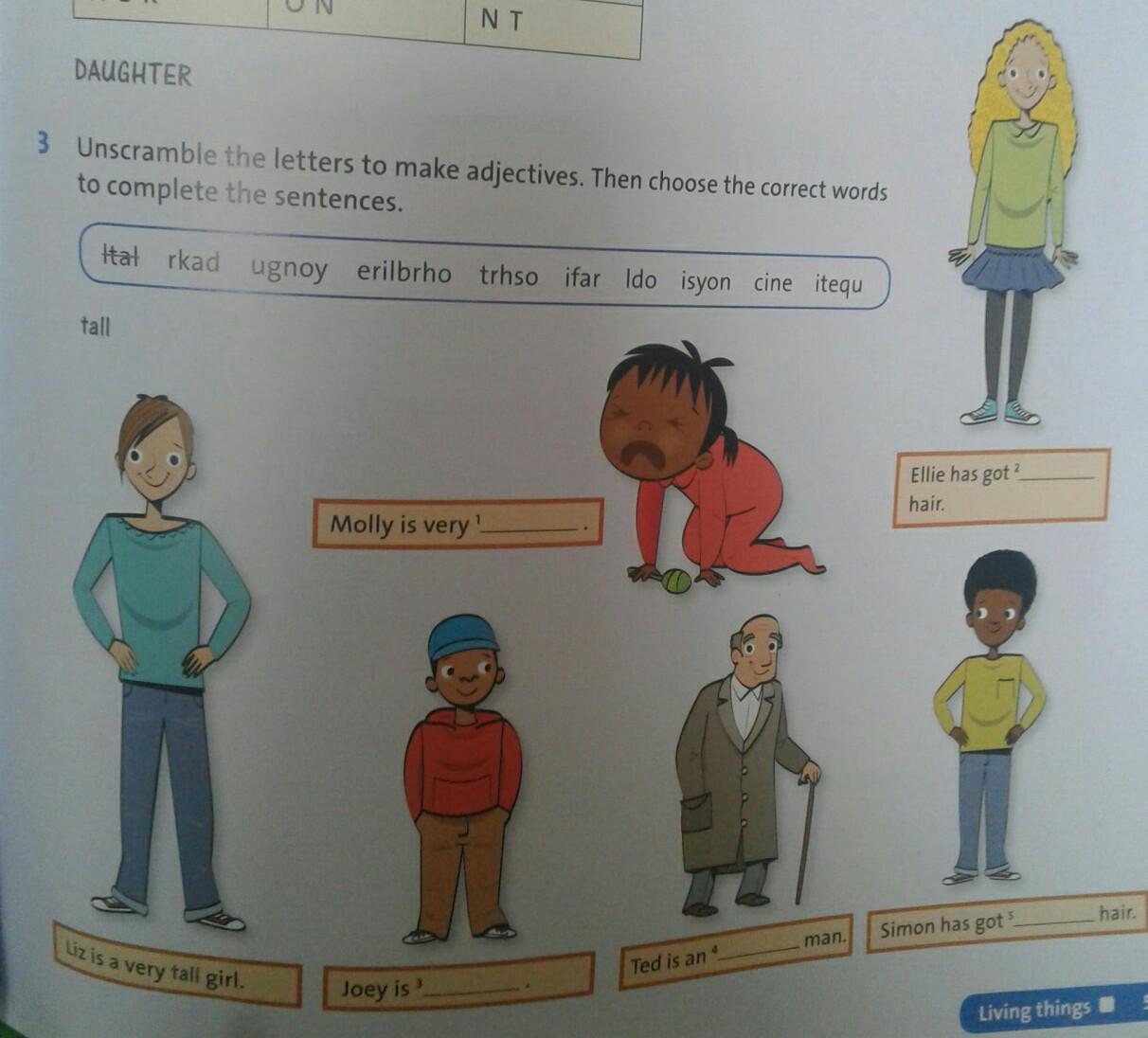 Слова в рамке: tall, dark, young, horrible, short, fair, old, noisy, nice, quiet