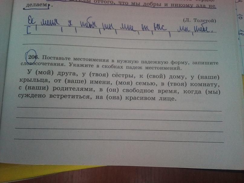 У моего друга (род. п.), у твоей сестры (род. п.), к своему дому (дат. п.), у нашего крыльца (род. п.), от вашего имени (род. п.), мою семью (вин. п.), в твою комнату (вин. п.), с нашими родителями (твор .п.), в его свободное время (вин. п.), когда нам суждено встретиться (дат. п.), на её красивом лице (предл. п.).