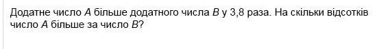 Припустимо що В = Х, тоді А = 3,8; Нехай В = 10, тоді А = 38; якщо А + В = 100%, тоді... А + В = 48; 48 - 100%, 10 - у%; у = 125/6%; 48 - 100%, 38 - к%; к = 475/6. 475/6 - 125/6 = 58,(3)%.