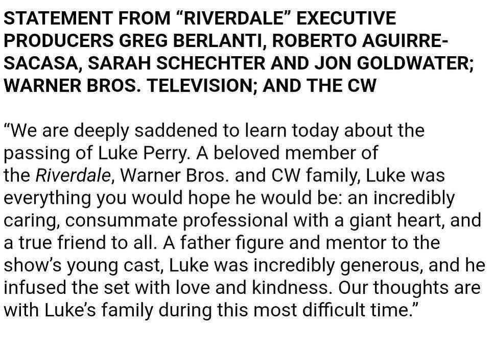 Мы глубоко опечалены, узнав сегодня о кончине Люка Перри. Любимый член семейства Ривердейл, Warner Bros. и CW, Люк был всем, на что вы надеялись, он был: невероятно заботливый, непревзойденный профессионал с огромным сердцем, и верный друг для всех. Люк был отцом и наставником молодого актера сериала, Люк был невероятно щедрым, и он наполнил съемочную группу любовью и добротой. Мы думаем о семье Люка в это самое трудное время ».