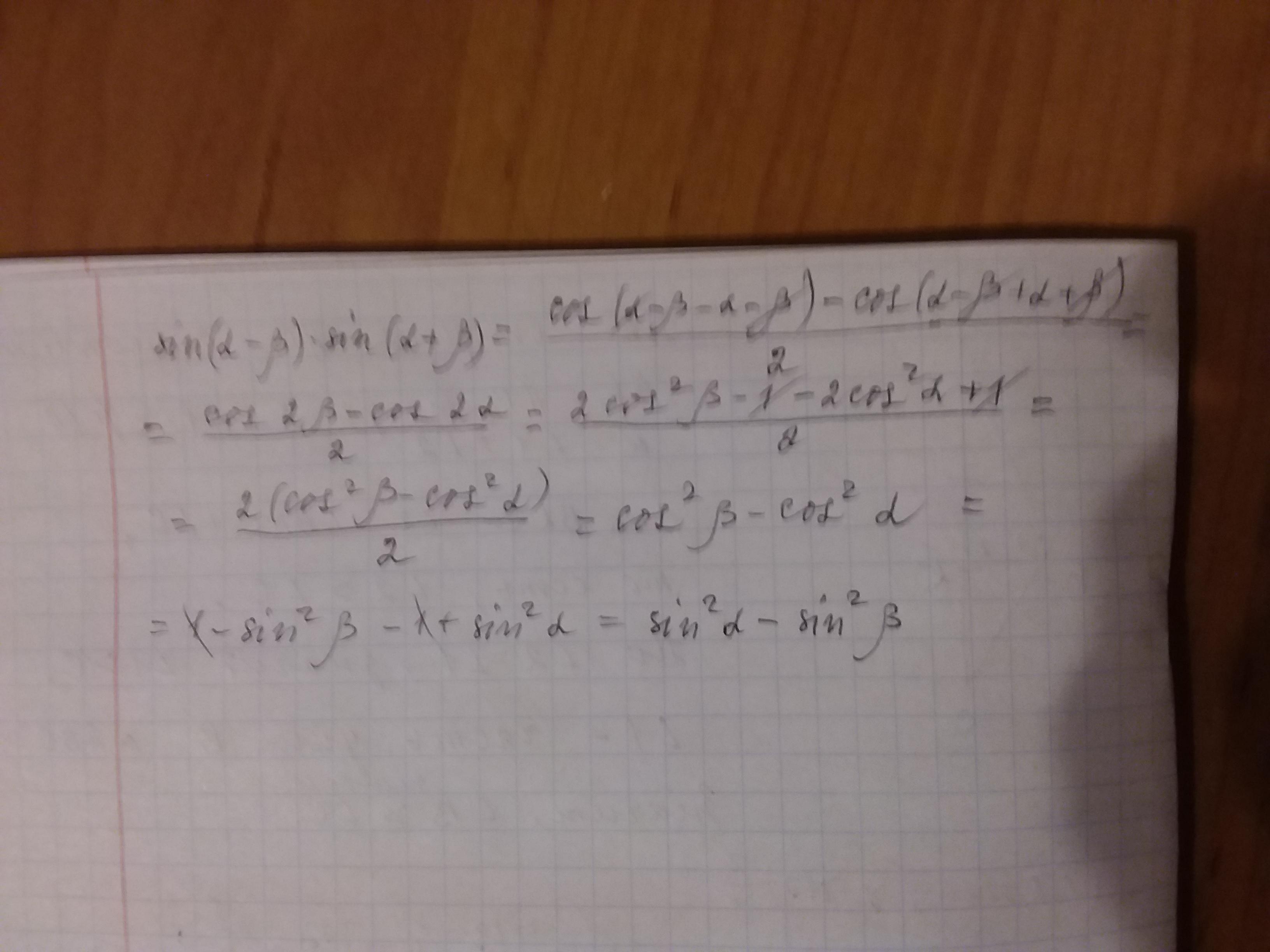 Доказать тождество: sin (a-b) sin (a+b) =sin^2 a- sin^2 b