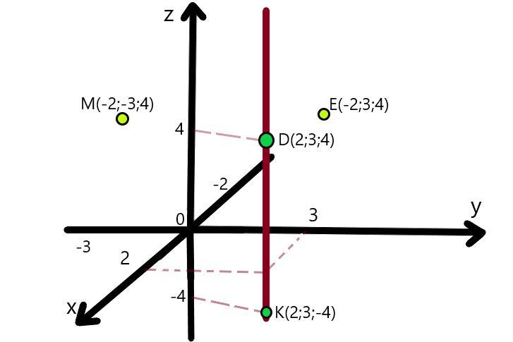 Які з точок Д ( 2,3,4), Е (-2,3,4), К (2,3,-4), М (-2,-3,4) лежать на одній прямій, паралельній осі аплікат?