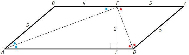 AE и DE - биссектрисы параллелограмма ABCD, точка E лежит на BC. Точка F лежит на AD, EF⊥AD. AB=5 см, EF=2 см.
