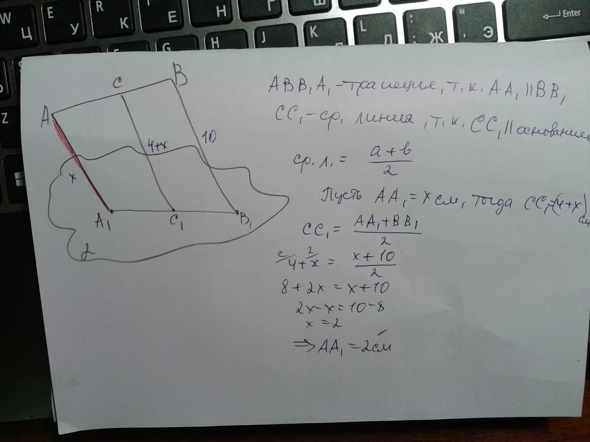 Отрезок АВ не пересекает плоскость альфа, через концы отрезка и его середину проведены параллельные прямые пересекающиеся в плоскости альфа в точках А1, В1, С1.Найти АА1, если ВВ1 = 10 см., СС1 = 4 см длиннее АА1.