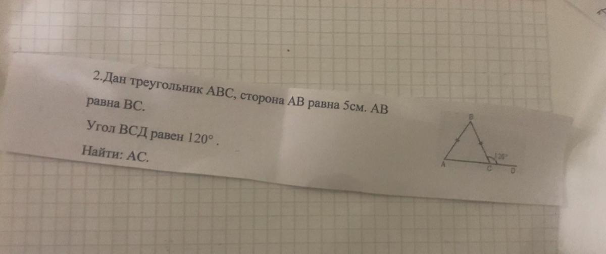 Угол ВСА = 60 градусам (т.к 180 -120 = 60). Треугольник равнобедренный по условию, следовательно угол ВАС равен так же 60 градусам. Угол АВС будет равен так же 60 ( т.к 180 - 60 - 60 = 60). Следовательно, треугольник равносторонний, АС = 5 см