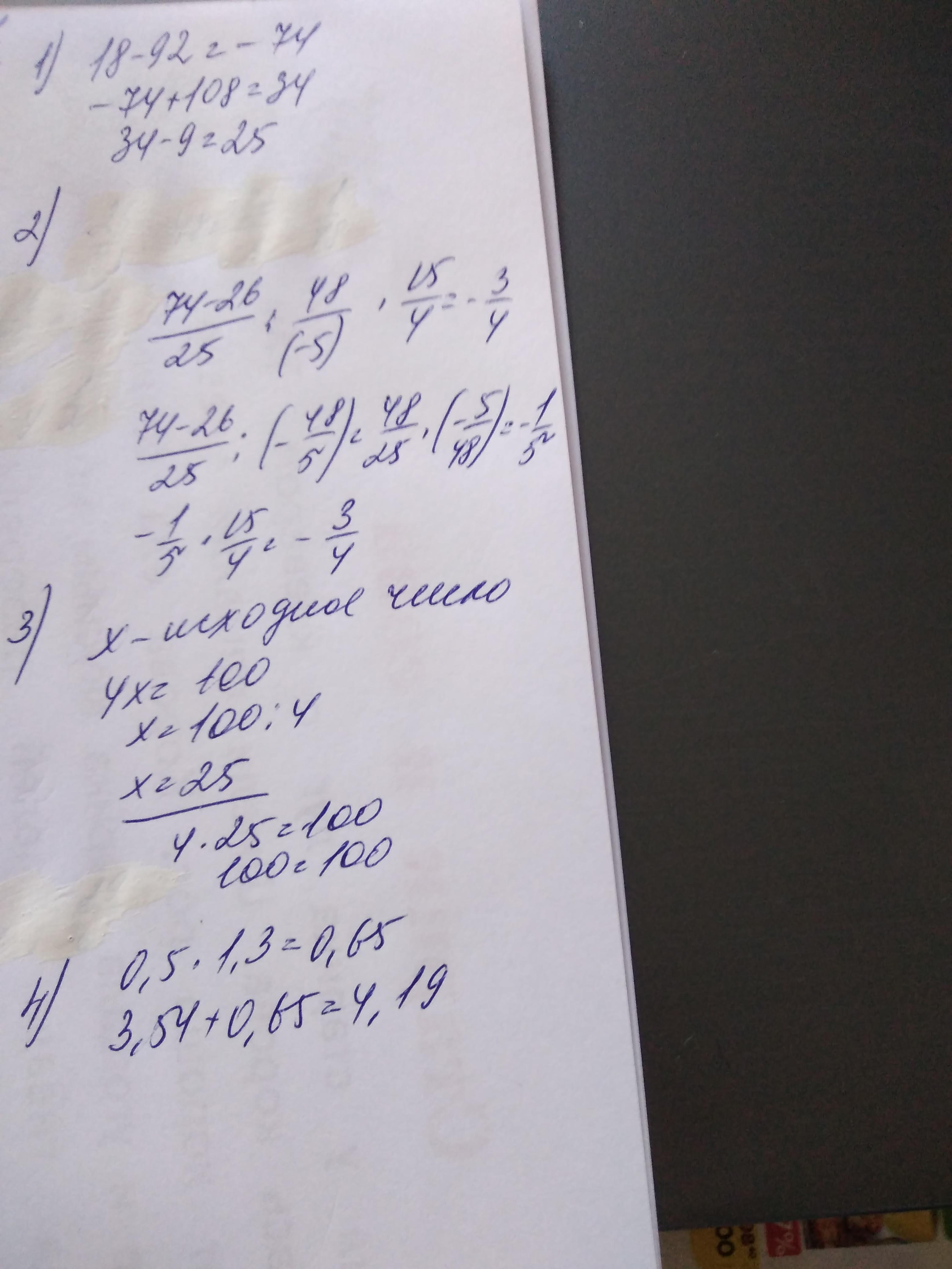 1) Вычеслите 18-92+108-9. 2)Вычеслите 74-26/25:48/(-5)*15/4. 3)число увеличение в четыре раза и получилось 100 найдите исходное число . 4) Вычеслите 3.54+0.5*1.3