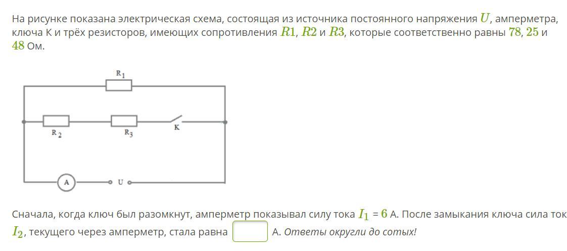 R=R1*(R2+R3)/(R1+R2+R3)=78*(25+48)/(78+25+48)=37.7 Ом (после замыкания ключа)
