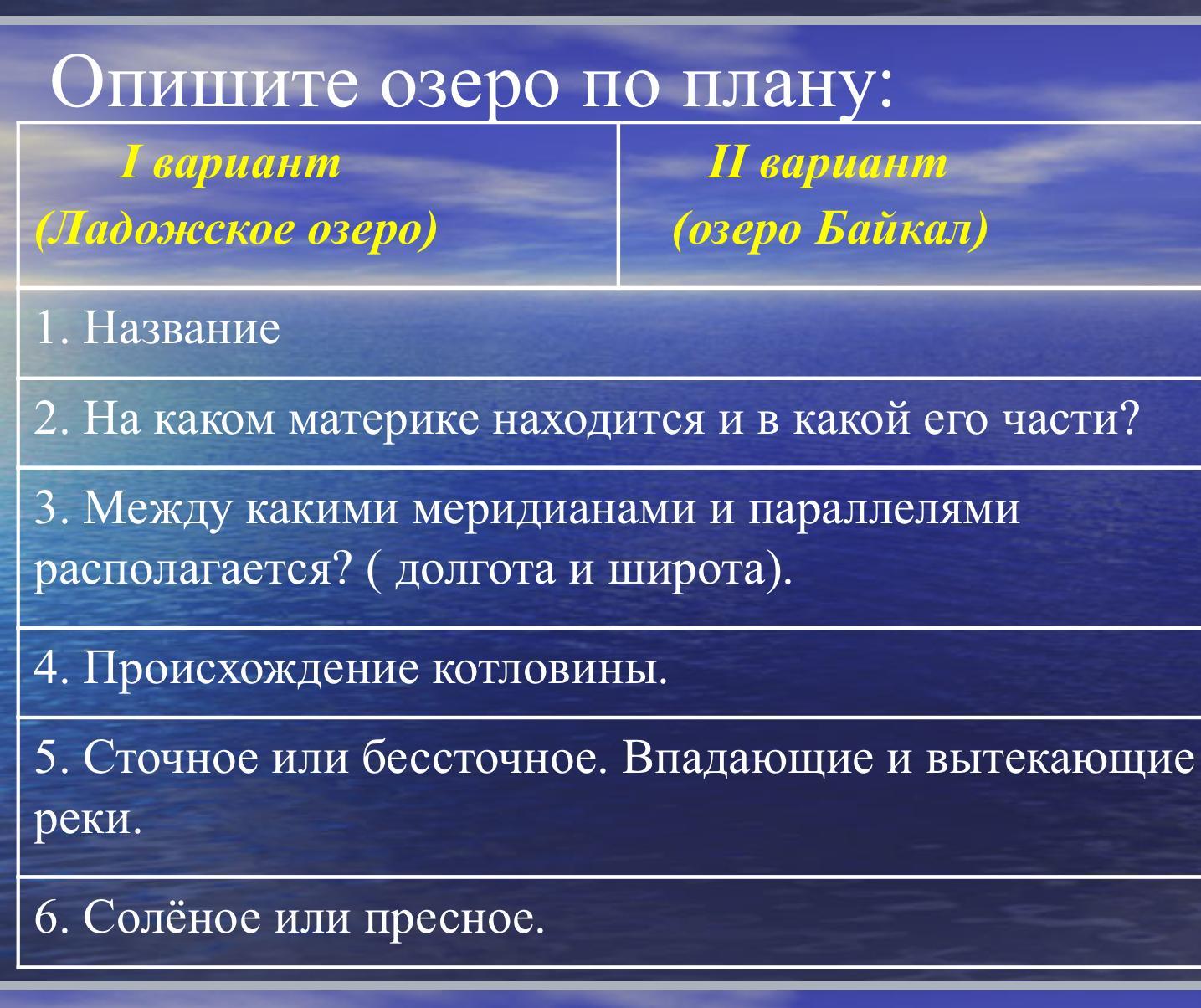 1 озеро байкал 2 находится в восточной части материка Евразия страна россия 3 105-110 градусов восточной долготы но оно вытянуто на восток 55-52градуса северной широты 4 четвертичный периол проискхождение катловины 5 сточное впадает река лена , а вытекает Ангара 6 самое глубокое пресное озеро в мире