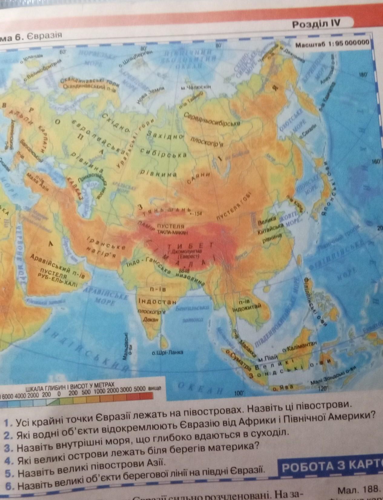 Крайні точки материка Євразії: на півночі — мис Челюскін, 77°43' пн. ш., на півдні — мис Піай, 1°16" пн. ш., на заході — мис Рока, 9°34' зх. д., на сході — мис Дежньова, 169°40' зх. д. Ряд островів на південному сході Євразії розташований у Південній півкулі. Євразію омивають такі океани: на заході — Атлантичний, на півночі — Північний Льодовитий, на півдні — Індійський, на сході — Тихий, і їхні окраїнні моря. На південному сході австрало-азійські моря відокремлюють Азію від Австралії, на північному сході — Берингова протока від Північної Америки, на південному заході — Гібралтарська протока, Середземне і Червоне моря від Африки, з якою Євразія з'єднується Суецьким перешийком.