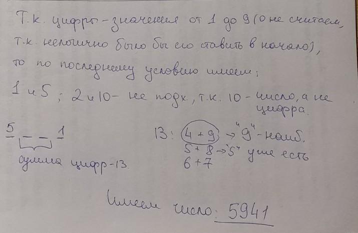 Загадано число которое записывается различными цифрами об этом числе известно: если первую и последнюю цифры зачеркнуть то получится двухзначное число которое при сумме цифр равной 13 является наибольшим. Первая цифра больше последний в 5 раз. Пожалуйста ответ с решением