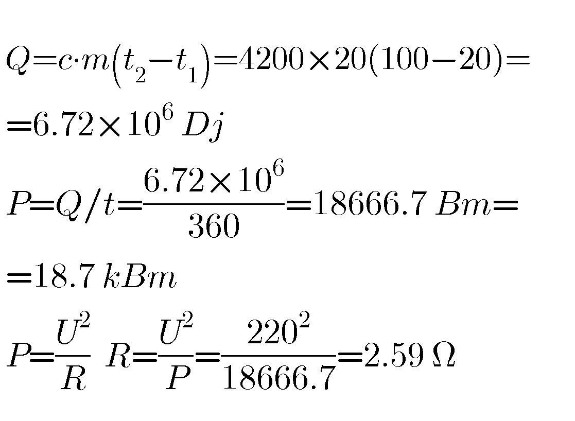 В электрочайник налили 20 литров воды,при температуре 20 градусов Цельсия,вода закипает через 6 минут.Какова мощность электрочайника?Чему равно его сопротивление?Напряжение в розетке 220 вольт